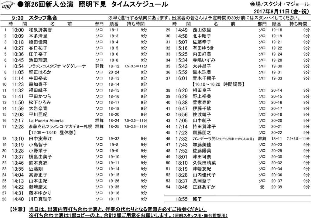 8月11日(金・祝)に行われる、バイレソロ、バイレ群舞を対象とした照明合わせの時間割が決定いたしました。